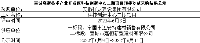 宣城高新技術產業開發區科技創新中心二期項目預拌砂漿采購結果公示