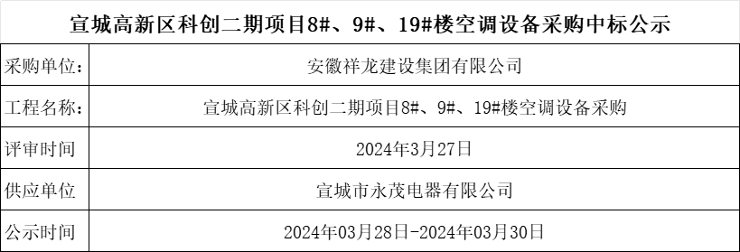 宣城高新區(qū)科創(chuàng)二期項目8#、9#、19#樓空調(diào)設(shè)備采購中標公示